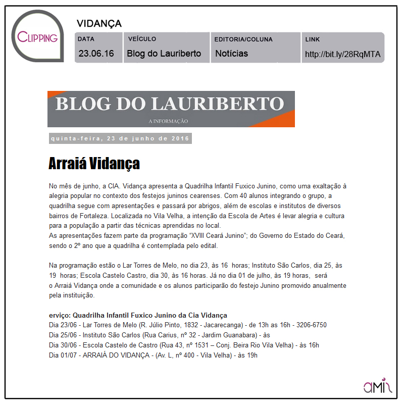 Com um trabalho aprimorado na força da cultura popular, o grupo de integrantes da Quadrilha Fuxico é composto por crianças, adolescentes e jovens atendidos na Escola de Artes e Ofícios Vidança que desenvolve há 37 anos um trabalho voluntário ministrando aulas de ballet clássico, danças dramáticas, laboratório de criação coreográfica, dança criativa, alongamento, consciência corporal, criações viso-manuais, criações literárias, capoeira, hip-hop, percussão, carpintaria e corte e costura. A formação do Grupo “Fuxico Junino” consiste em difundir as referências da cultura tradicional, trabalhada pela Escola Vidança na composição dos seus espetáculos, como é o caso do Espetáculo Catu Macã Guerra Bonita, que traz referências do Maracatu. Outros trabalhos, tais como “Histórias de Acordar o Amanhã” e “Esquadras”, também trazem danças populares em suas criações coreográficas como baião, coco, xaxado, bumba meu boi.Em 2015 a Quadrilha Fuxico Junino foi contemplada no XVII Edital Ceará Junino recebendo o apoio do Governo do Estado do Ceará e da Secretária de Cultura/SECULT o que possibilitou ao grupo realizar 17 apresentações em diversas entidades que desenvolvem atendimento ao publico infanto-juvenil, idosos, incluindo, as ruas e praças da comunidade dos bairros Vila Velha, Ellery e Carlito Pamplona no período de 05 de junho a 30 de julho/2015.