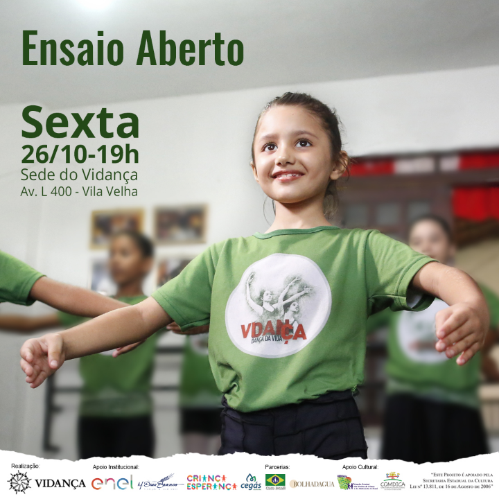 O Ensaio Aberto é um evento realizado mensalmente, onde o Vidança mostra aos moradores da comunidade e região o que tem sido ensaiado ao longo do mês na Instituição. Na edição desse mês o Ensaio apresentou trechos do balé "Histórias de Acordar o Amanhã", Hip Hop, Flauta. Contou com a apresentação do "Tambatuque DasMarias" com participação do "Tambatuque do Vidança". Nesse dia também ocorreu entrega dos certificados do "Vidança a Dança da Vida", projeto apoiado pela Casa Civil. Além de apresentação dos grupos de dança, Ritmo Envolvente e Ballet Nick.